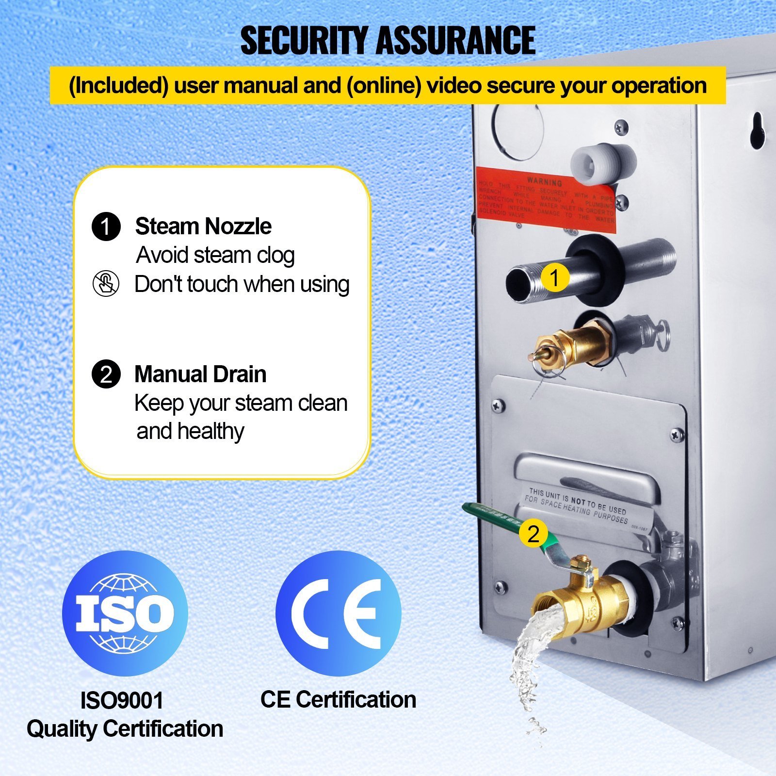 3.Multiple Protection: If you have problems with installation and operation, feel free to watch the online video included in the user manual. In addition, the steam nozzle can prevent steam from clogging, and the manual drain keeps your steam cleaner. ISO9001 Quality and CE certification included.